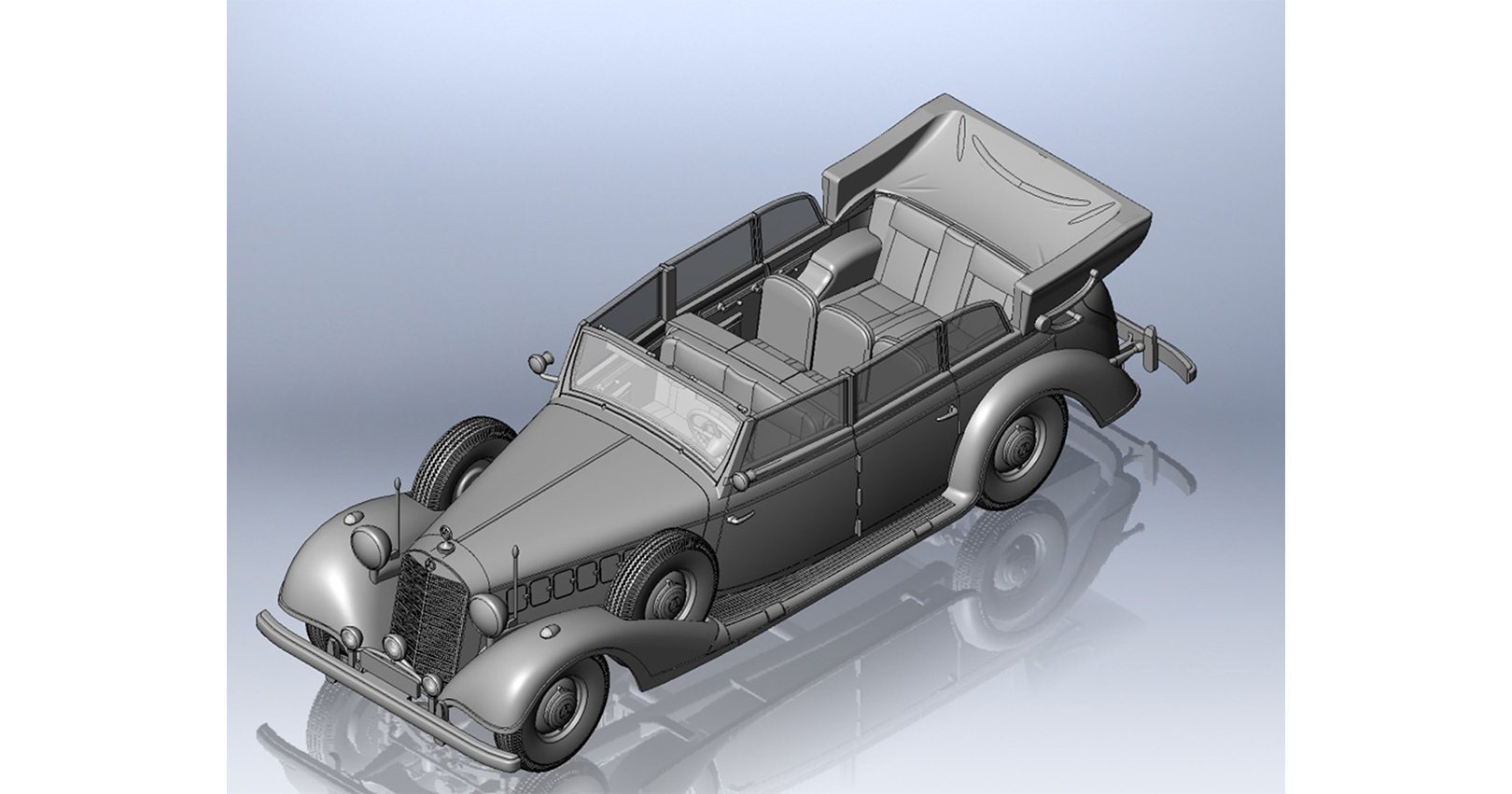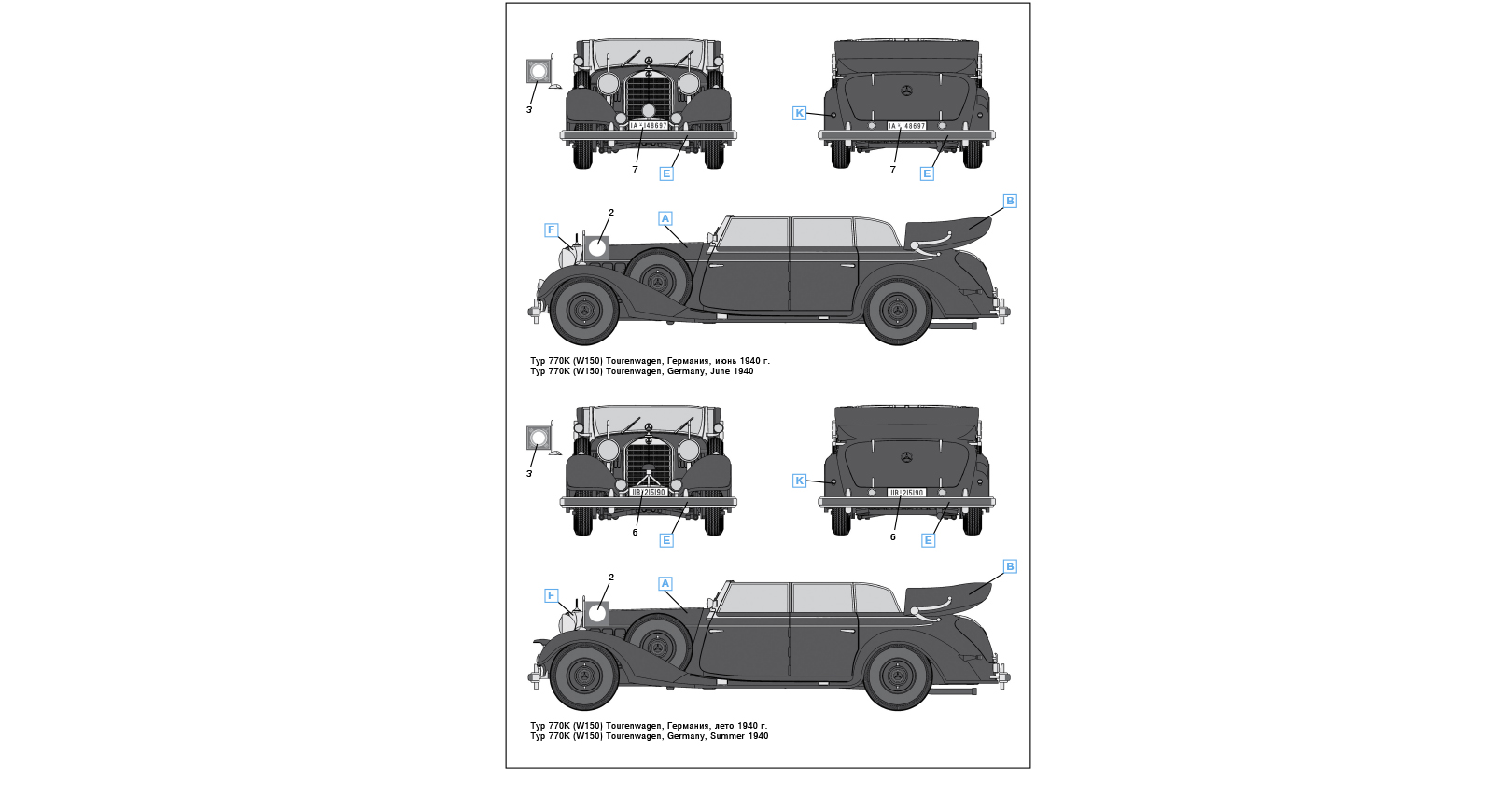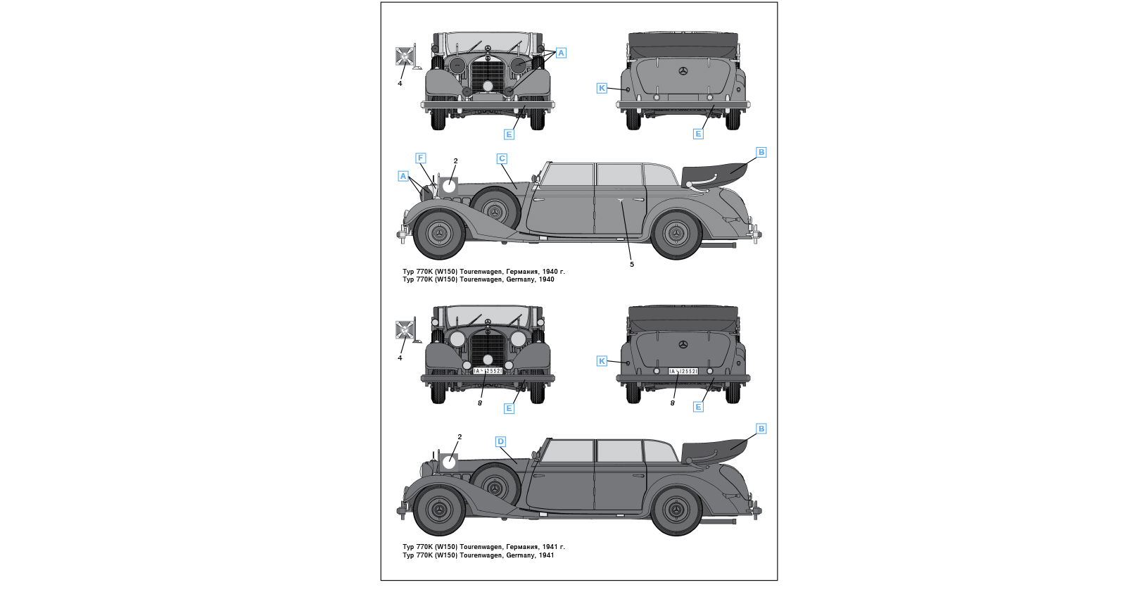 The passenger car Typ 770K (W150) was designed by Daimler-Benz in 1938. It became the top of the company pre-war model range. This car had 8-cylinder engine of 155 hp (with compressor 230 hp) and 6 passenger seats. There were produced only 88 Typ 770K (W150) cars up to the 1943, 46 of them with Tourenwagen type open bodies. Some cars had armored bodies. They were used mainly by the highest state and military authorities of Germany.