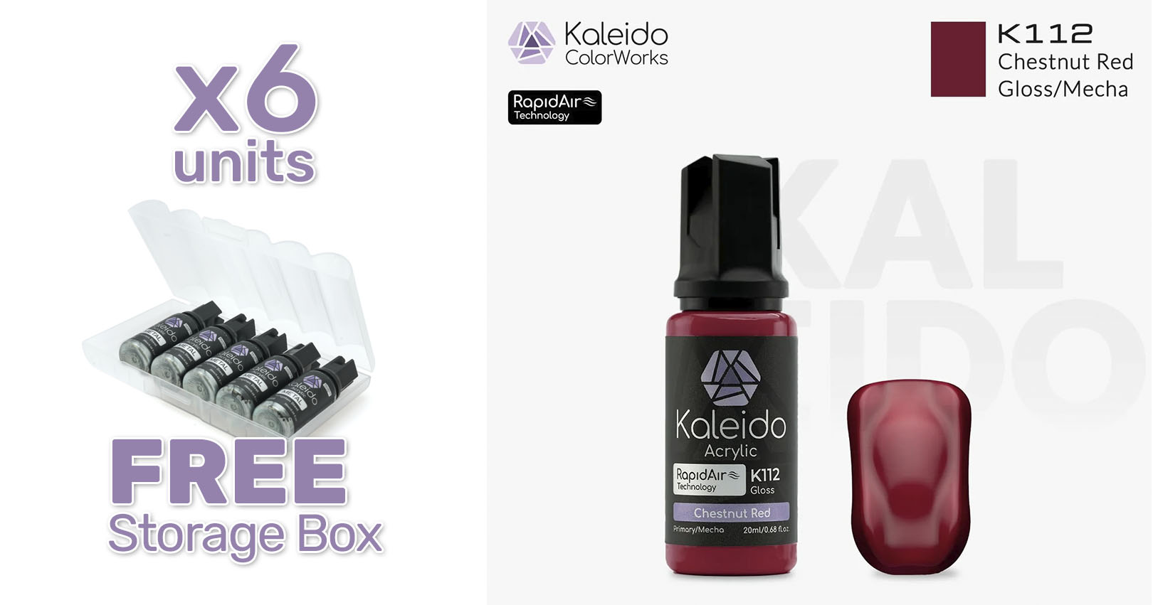 Pintura Kaleido K112 rojo castaño brillante. Rapidair 6x20ml. Mecha