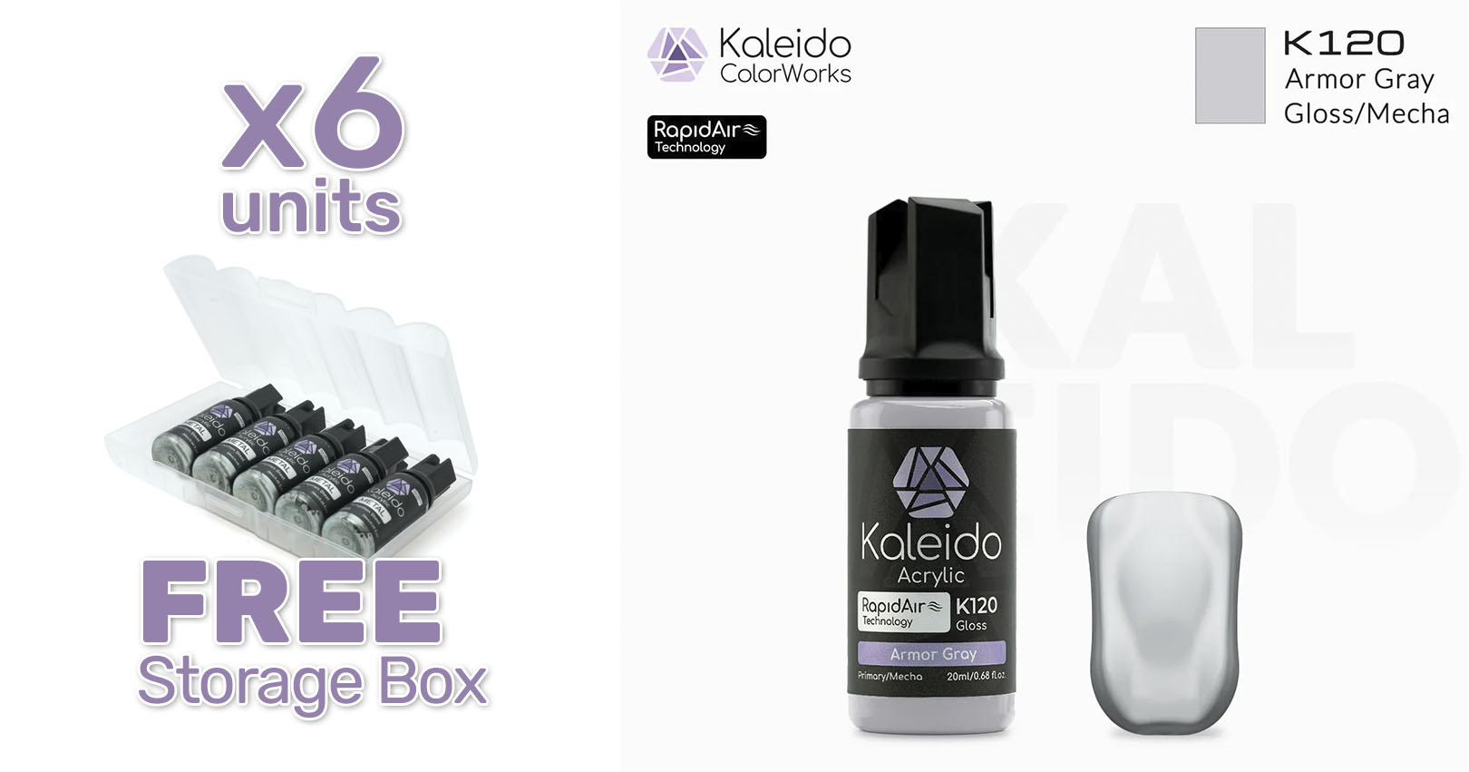 Pintura Kaleido K120 gris armadura brillante. Rapidair 6x20ml. Mecha