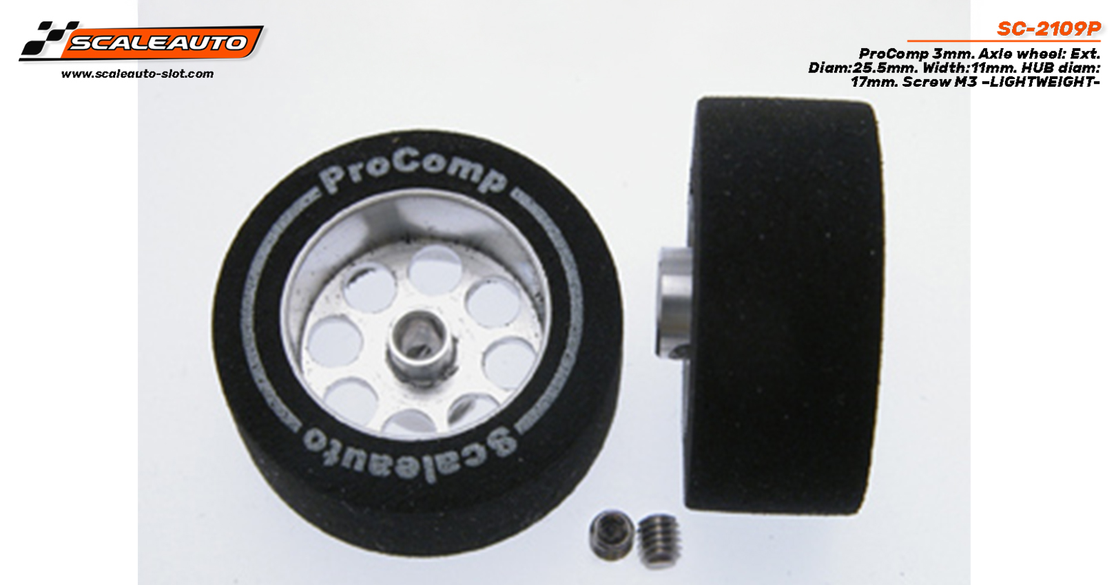 Rueda esp. 25.5x11mm, eje 3mm. llanta 17mm. Aligerada, Procomp, Tornillo M3.