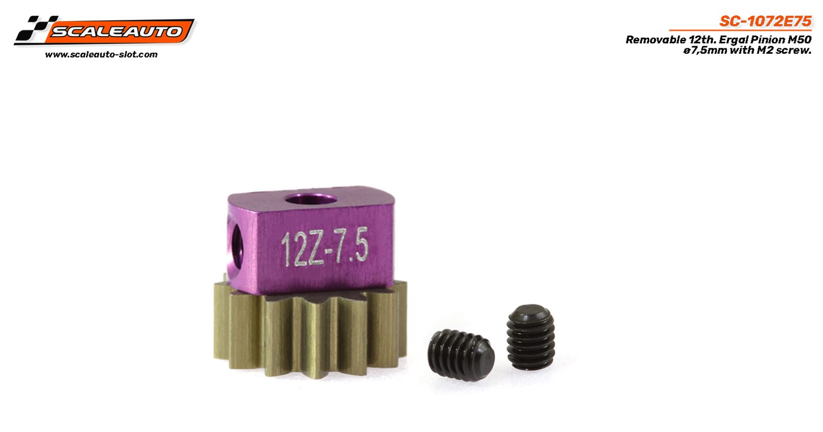 Piñón Extraíble 12d. M50 ø7,5mm en Ergal para eje 2mm con Fijación mediante tornillo M2.5mm.